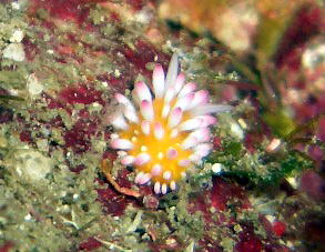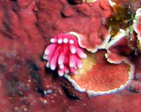 | こちらも小さくて可愛いウミウシの代表 ヒロウミウシ ピンクのふさふさをよーく見ると、 触角の部分は、濃いピンクになっていますよ〜(>_<) |