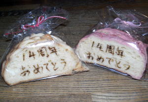| そして、カーン14周年記念に皆様からいただいた お祝いの品々♪ まずオシャレな紅白のワイン!! 『美ら蛍』〜〜(o^_^o) 14周年のケーキ♪ そして、『14周年おめでとう』の字がはいっているラスク☆ 本当に感謝です!! みんなで、おいしくいただきました!! 皆さん、 ありがとうございますm(_ _)m |