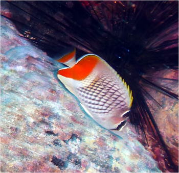割と珍しい アミメチョウチョウウオが居ました! オレンジが鮮やかで綺麗ですよ。 |