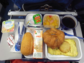 深夜、着陸1時間前に軽食。 クロワッサン、食べ放題! ・・・・というほど、食べられないんですけどね。 |