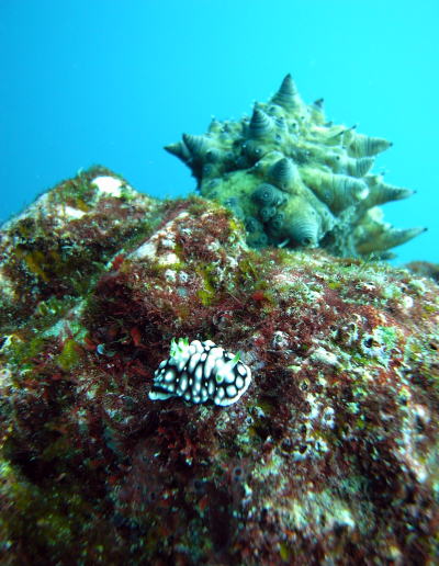 | 備前の根のトップでは、こんなシーンがっ!! キカモヨウウミウシがオニイボナマコに襲撃されそう(>_<) どんどん後ろから怪獣が襲ってくる〜〜!! なんかナウシカに出てきそうかも??? |