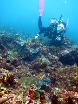 | 最終日だけのご参加だったSりん 全然逃げない可愛いカメさんと 記念撮影でーすv(^-^)v 最近、ほぼ同じ場所で二匹のウミガメさんに出会えます! ほんとに可愛いですよ〜っ! |