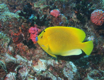 | ソメワケヤッコのちびっ子も スズメダイやチョウチョウウオを 追い払いながらサンゴの隙間を 陣取っていましたよ〜(^○^) |
