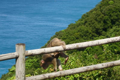 | 日曜は、一旦潜ってみたものの 台風のうねりの影響は大きく、 止むなくダイビング中止となりました(T_T) 仕方なく展望台へ行くと 久々にお猿さんにあえました〜っ♪ |