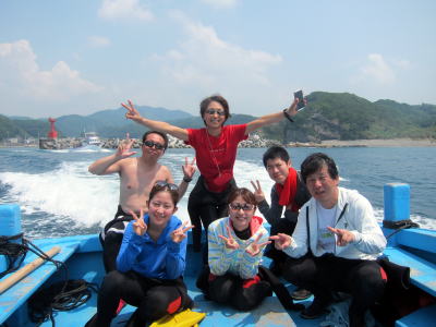 | 一緒になった皆様と記念撮影♪ キラキラのキビナゴの大群に囲まれて 幸せな100本記念になりましたか〜?! |