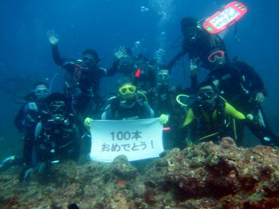 そして、午後からはOさんの100本記念! 10年越しの100本ですが 海の中でプカプカするのが大好きなOさん これからも、地道に潜り続けてくださいね〜っ!! |