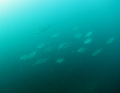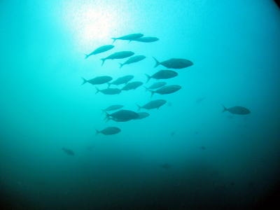 南の海のハタタテダイと 温帯エリアのニザダイやメジナが 一緒に泳いでいる海 |