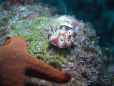 かわいいマダライロウミウシちゃん(*^。^*) となりのヒトデと比べると ちっちゃさが分かりますね〜!! |