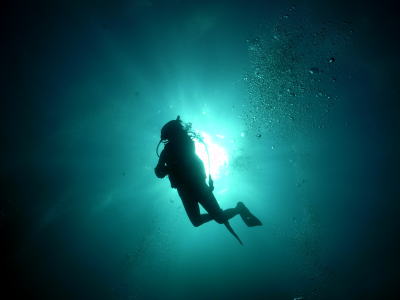 | ワイド撮影に最近はまってきたというO様の写真 太陽をバックにプカプカしているダイバー めちゃくちゃかっこよく写ってますね〜♪ |