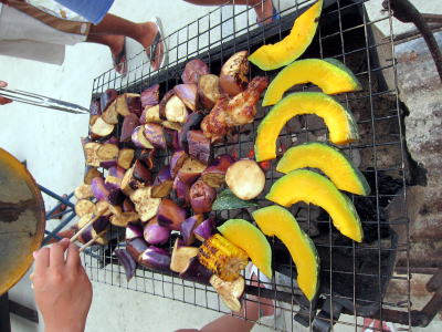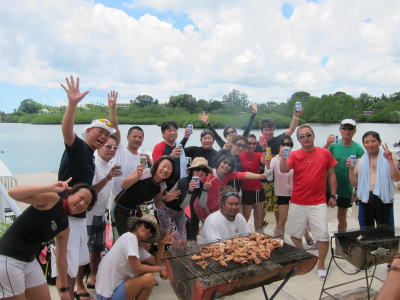 | 島に戻ってからは 皆でBBQターイム♪ 新しくなったオアシスダイビングサービスで 海を見ながらカンパーイ(^○^) チキンにポークにウィンナーに パラオで採れたお野菜にetc 美味しくいただきました! |