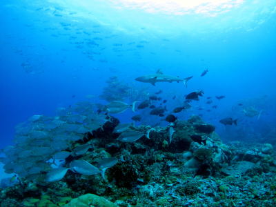 | 浅場では メアジの群れにグレイリーフシャークが突っ込み あとからギンガメアジの群れもやってきて、 ナポレオンは普通だし なんじゃこりゃーなダイビングになりました(^○^) |