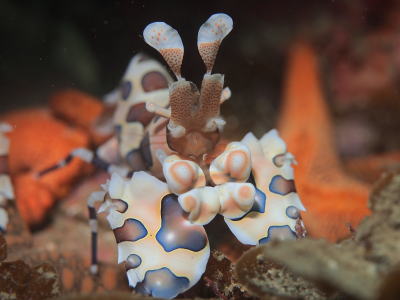こちらは人気者の フリソデエビ〜! 台風も過ぎ去って、のんびりお食事中です(*^。^*) |