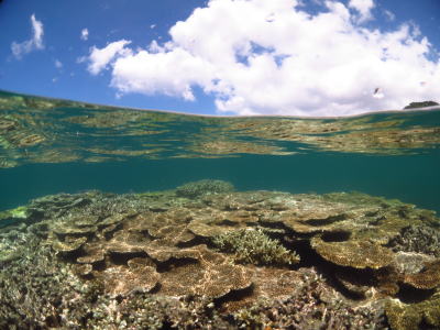 半水面写真もこの通り〜♪ 青い空と元気いっぱいのサンゴ 両方楽しめるんですね〜!! |