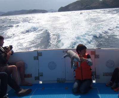 こちらは2日目の映像ですが、 なんとこんなに船の真横に顔をだしています! 様子を伺っていたんでしょうね〜(^-^) |