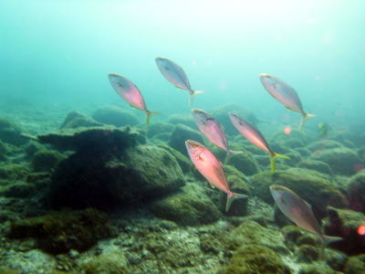 | 今回は毎ダイブと言っていいほど キビナゴ祭り&そこへ突っ込むカンパチの子供達の姿がっ! そして、写真をよーく見たら なんと1匹だけ中にツムブリさんも混じってました(^○^) |