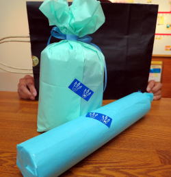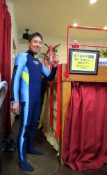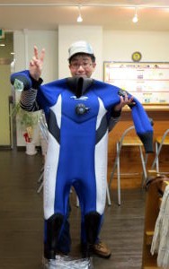 Kさんに、先日ご注文頂いたウエットスーツをお渡しです。