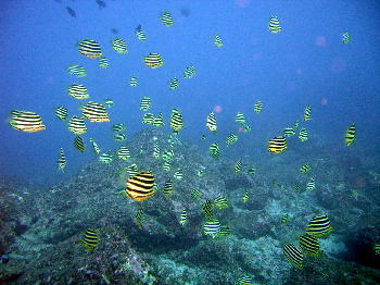 | 海の中も、ブルーです! 住崎では、カゴカキダイの群れが お出迎えしてくれました! フリソデエビもまだ居てくれましたし ピカチューウミウシも そろそろ登場です! |