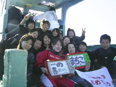 | 忘年会ツアーへ行って来ました! 毎年恒例ツアーですが、今年の土曜日は串本でダイビング! みなさんベテランさん揃いでしたので、1本目は早めに出港準備をして外洋にGO! 少し流れが入っていましたが、頑張ってドロップオフへ! 水深28Mには、赤のチェックが可愛らしいクダゴンベ! さらに根の上に戻ってくると、上空にはマダラトビエイ! 2本目の住崎では、エントリーするなりカゴカキダイやアマミスズメダイ、アカヒメジが い〜っぱいでお出迎えしてくれました! 1本目に頑張ったから、2本目はまったりとしよ。ということで根の周りで楽しんでいると、 カエルアンコウいたよ〜の情報が!行かなくては〜とやっぱり泳いで、プリティーカエルアンコウに 癒されてきました〜! 串本で温泉に浸かり、ちょっと仮眠が取れたところで、白浜へ!到着すると少しして土曜日合流組が到着! 宴会が始まりました! 民宿まるきさんのクエ鍋は、毎年最高です!タップリと脂の乗った天然クエがいっぱい! 22時過ぎにはもう一組のゲストが到着。夜中12時頃からKさん&Nさんのお誕生日お祝いや スタッフの出し物やゲストの歌&踊りなどもあり、全員でおどりまくりましたよ。 それ以降は、まったりと飲み明かし、明け方4時ごろまで宴会は続きました。 朝8時。さっき寝たトコやん!といいつつも、美味しい朝食を頂き、白浜観光へ! 千畳敷や、三段壁、白浜とれとれ市場を満喫して 夜17時には、お店に帰ってきました〜(^-^) ご参加いただきました皆様、ありがとうございました! 今年都合が付かなかった、と言う皆様も、来年は是非おこし下さいね。 来年も、よろしくお願いいたします! |
