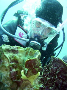 | Kさんがジット見つめるのは、 見ているだけで幸せになれそうな、 黄色いカエルアンコウちゃん。 スリバチカイメンに隠れていますよ。 |