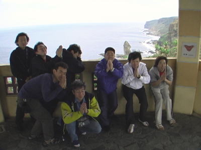 | 最終日は、ダイビングが終るや否や準備して、 島内観光へ! 時間があまりなかったのですが、 素晴らしい皆さんのスピーディーな動きで、 主要な観光地は全て網羅できました! 男性陣は、立神岩にお祈り〜っ って、何祈ってるのかな〜(^_-)-☆ |