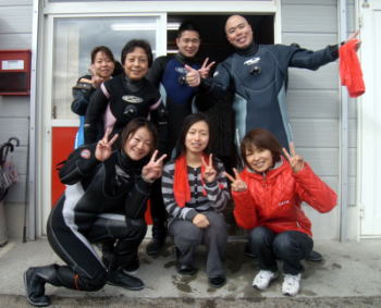 が、潜り納めをしなくてはということで、冬の古座川へ! 水温9度でしたが、しっかり着こんでエントリーしたので、寒さは全く感じませんでしたよ。 恐ろしく大きな、白とオレンジのコイが目の前に現れました〜ワオ そして、迎えた新年。 水中カウントダウンは出来ませんでしたが、陸上で宴会〜♪ 早朝から初日の出もしっかり拝みましたよ。 1日は餅つき大会! 臼と杵を使っての餅つきは、なかなか経験できるものではありませんよね。 皆さん、楽しそうについていらっしゃいました。 ようやく1月2日。串本へエントリー! 待ち焦がれた海は、とても青く、キビナゴやツムブリの群れ、 話題のボロカサゴや、青と赤のフリソデエビのペア。 ミナミハコフグの幼魚もまだ元気に泳いでいました〜! |