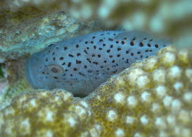 | サンゴの隙間には可愛い仲間が住んでいますよ! 赤字に斑点の可愛いカスリフサカサゴです(*^。^*) |