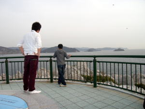 白崎の展望台です。 広い海が一望できました〜 「何でこんなに岩が白いんや・・・」 明日も潜るで〜 と気合が入ります! |