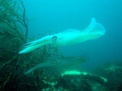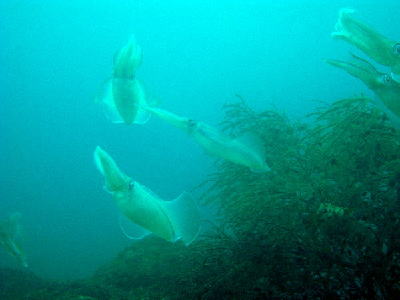| とにかく凄かったのが、アオリイカの産卵!!多い時には30〜40匹くらいのアオリイカが大集合して、 オスはメスを取り合い、激しいケンカシーンまで見られました\(^O^)/ 目の前で繰り広げられる白熱したシーンに、見とれていると、あっという間に30分が過ぎていましたよ(>_<) |