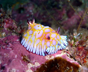 ![]() ![]() イスズミ礁では、まるで「ウミウシ銀座」のように 数多くの美しいウミウシの姿が見られました! 左は、シンデレラウミウシ 右は、ボブサンウミウシでーす♪ |