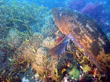 | 卵を守るアイナメのお父さんと、卵です。 良く見ると、いろんな色の卵が 何塊もあります。 これはアイナメちゃんが一夫多妻制だから なんですね〜 たくさんのメスに、たくさん卵を産ませた 男前なアイナメパパなのです。 |
