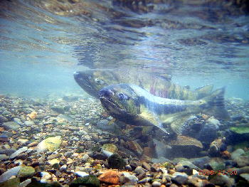 シロザケのペアです! ちょっと小さくてやさしい顔立ちなのがメス。 きりりとした顔立ちの、向こう側がオスです。 産卵は上手くいったのでしょうか(^-^) |