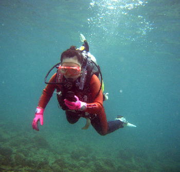 こちらもダイバーになって間もないKちゃん 中性浮力バッチリ! 青い海に溶け込みました! |