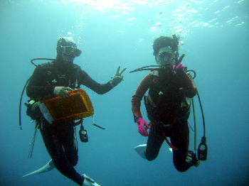 | 先月末にダイバーになった、Fさん。 ちょっぴり先輩ダイバーMさんと一緒に 今回はアドバンスのナビゲーションにトライ! 落ち着いて、バッチリとブイまで帰る事ができました! |