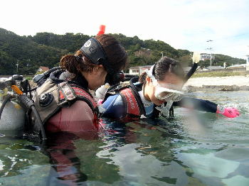 | オープンウォーター講習生のKさんとMさん! バディで協力し合って、フィンを履きますよ。 おっとっと〜 |