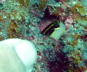 | 可愛い可愛いヒトスジギンポのお子様です♪ 人差し指の爪と比べると、 小ささが良くわかりますね! 久々にツアーご参加のMさん撮影です |