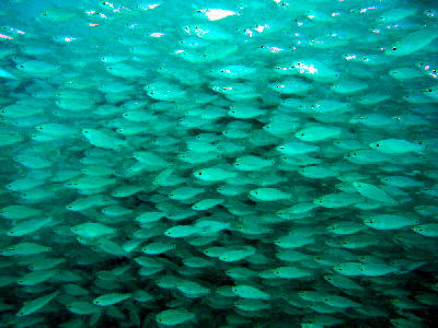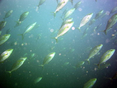 見て下さい、この魚影!!!!! 潜降したら、目の前にものすごい大群がやって来ました\(◎o◎)/! カンパチとツムブリ 100匹を越える大群でしたよ〜\(^O^)/ ピヨピヨチームの皆様も 見とれていましたね〜!! |