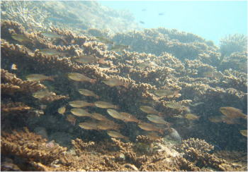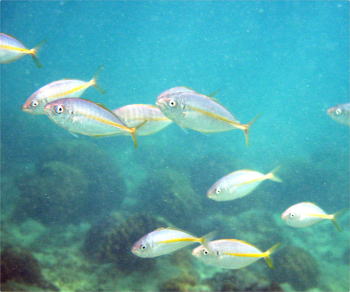 | 沖まで泳いでいった帰り道。 シマアジのベビーちゃん達が 私達の周りをくるくる回ってくれました(^-^)/ 可愛かった〜♪ |