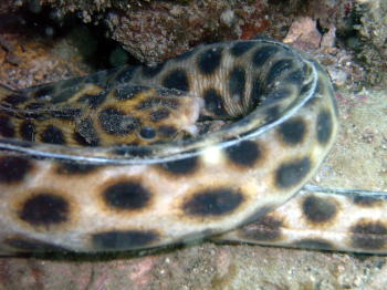 岩とサンゴの隙間には モヨウモンガラドオシが じぃーっとして隠れていました! ナイトダイビングをすると するすると泳ぎ回る姿を見れたりします。 |