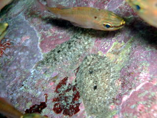 さて、問題です! この水玉模様はなんでしょう? 正解は… なんとモンガラカワハギの赤ちゃんでーす(o^_^o) まだかなり小さくて、ほぼ全身水玉模様でしたよ! そして、かなりの恥ずかしがり屋さんでした♪ |