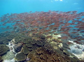 お盆の恒例!串本ツアー! 前半は荒れ模様だったビーチも 後半は穏やか!そして透明度もあっという間に 回復! クロホシイシモチの群れが、ものすごいことに なっていました! 見ごたえ抜群です! |