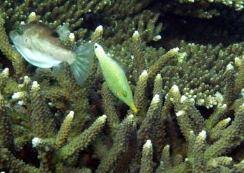 | 台風前に発見されていた テングカワハギちゃん! 一緒にキタマクラのお子様も写っていますが(*^_^*) 結構ぷりっと大きな子で 成長したのか、新しい子なのか。。。? |