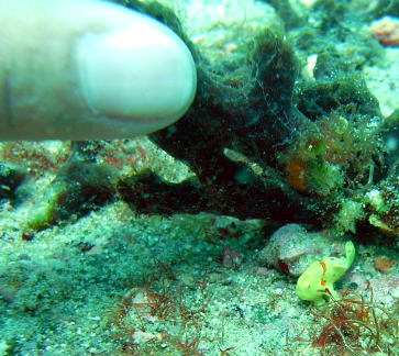 | 見てください、この小さなカエルアンコウの赤ちゃん!! 指の爪と比べても めちゃめちゃ小さいのが良く分かります(o^_^o) 発見者のMさんのお手柄なのでした〜♪ |