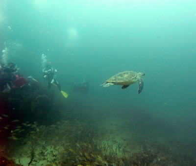 | なんとラッキーなことに ウミガメさんにも遭遇しましたよ! どこからともなく現れて 私達の目の前を泳いで行ってくれました♪ そして、カメさんの下側ではものすごい数のイサキが グルングルンまわってくれました(o^_^o) |