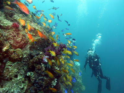キンギョハナダイやソラスズメダイなど とにかく魚が多くて うっとりのダイビングの連続でしたね〜♪ |