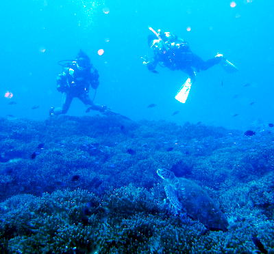 サンビラのウミキノコの群生の上でカメさんが休憩中!! フワッフワのベットはとっても気持ちがよさそうです☆ 思いがけない遭遇にピースサインのお二人(^о^) なんとこの後に、もう一匹現れたんですぅ〜♪ |