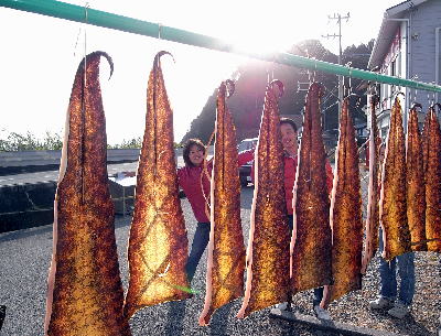 | おぉ〜見かけない光景がっ。 赤鯱のお隣で干物になろうとしているウツボです!! 串本周辺では普通に食べられているウツボ(*^_^*) 水中で見ていることを想像すると・・・・ね。 でも、ちょっと美味しそうだったりもして・・・ |