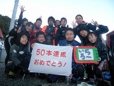 | 新年あけて1回目の、恒例新年会ツアー! いきなりの寒波に海は荒れがちでしたが、エントリーしてしまえば、そこは穏か、ビックリのブルーが広がって いました〜! 今回は年末年始よりも、水温が1〜2度UP!ドライスーツでエントリーすると、本当にあたたかでした! たくましく、3日間で8ダイブしてきましたよ! 3連休ということで、3泊4日、2泊3日、1泊2日と、思い思いの日程でお楽しみいただけました! アドバンス講習にチャレンジ中のNさんは、お休みの都合で泣く泣く途中でお帰りになりましたが 頑張って来て頂いてよかったです!いい海で楽しく潜れましたね。 中性浮力が取れたときの、あの感動は忘れられませんよね〜 その他の方はファンダイビングの皆様。 中には、MY器材デビューの方や、MYドライデビューの方もいらっしゃいましたね。 快適なダイビングには、快適なMYギア!皆さんが実感されていました〜! 今回の海は、カメ&カエルアンコウ&ウミウシ&水中散歩♪がとっても印象的でしたよ! 夜はもちろん、大宴会! チゲ鍋に舌鼓をうちながら、海のはなしや、プライベートトークなどなど、盛り上がりましたよ。 鍋の後はうどんに雑炊。底までしっかり食べきりました〜! 最終日には、出雲ビーチへ!普段はあまりエントリーしませんが、この日は一番穏かなポイントだったので 全員でエントリー!普段あまり出会わない生物と出合ったり、最高の透明度の中、飛んで飛んで〜 飛行隊を結成して、水中を存分に飛びまくりました! 最後には、ちょうどお誕生日だったSさんのお祝い!おめでとうございます♪ 奥様とこれからも楽しく潜って下さいね。 ご参加の皆様、ありがとうございました〜♪ |