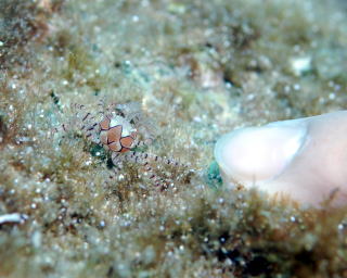 柏島固有のキツネメネジリンボウのチビっこ 目を通る黒いラインがはっきり分かりますね〜!! |