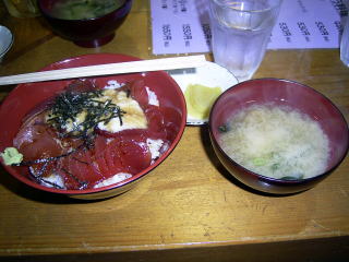 | もちろん、勝浦へ来たら「マグロ」でしょう! ということで、マグロ丼や、ネギトロ丼 そして、クジラもいただいちゃいました〜(^о^) 美味しかった〜♪ |