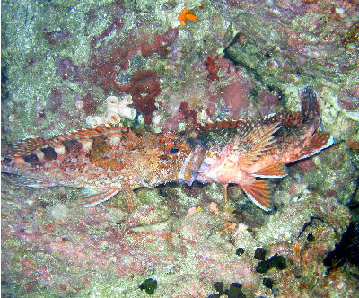 | カサゴがカサゴを食べてる? いえいえ、きっと縄張り争いですね(>_<) それにしても、お魚の世界は厳しいんですね〜! 頭がすっぽりお口の中に〜っ!! |